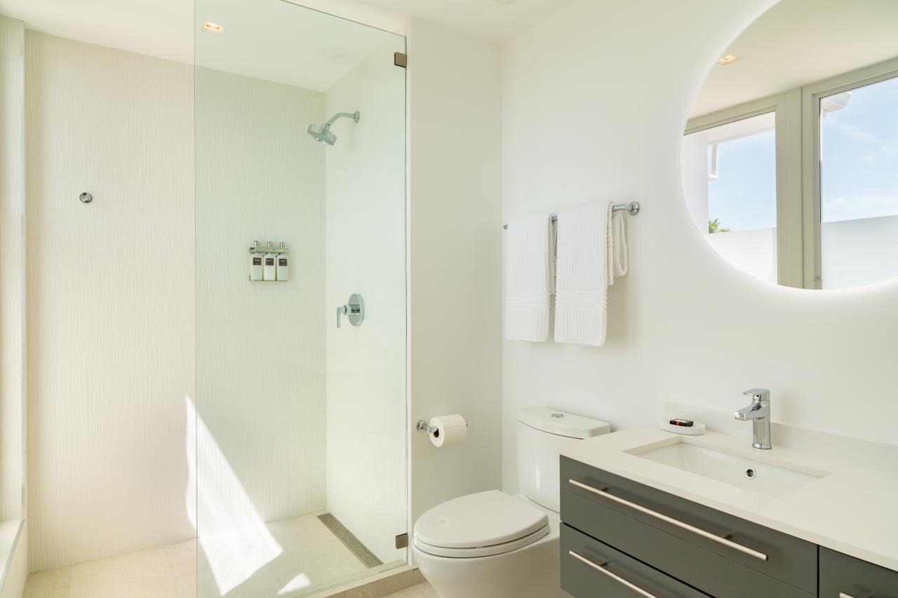 East Primary Bedroom: This room is located on the ground floor. The East Primary Bedroom is equipped with a king-sized bed, a ceiling fan, a TV, a closet with a safe, a pool/ocean view, direct access to the outdoor area, and an ensuite bathroom.