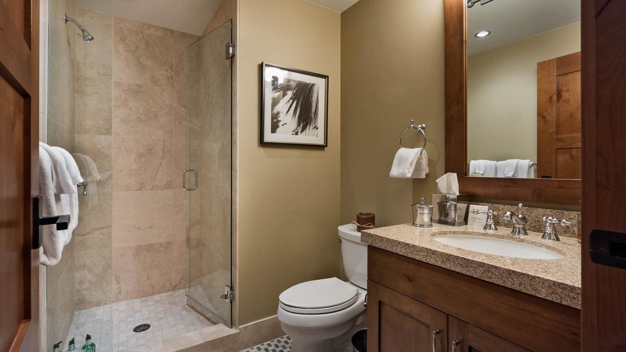 All One Steamboat Place residences feature rich colors, natural textures, and sumptuous fabrics throughout the home. The master bedroom offers a gas fireplace and large LCD TV. The main master bath features a steam shower and Jacuzzi tub. In this residence 2 bedrooms offer a King bed with private bath. The third bedroom has a Queen bed and a Queen over Queen bunk bed. The fourth bedroom offers two sets of bunks with Queen over Queen bed. All bedrooms have a private bathroom.