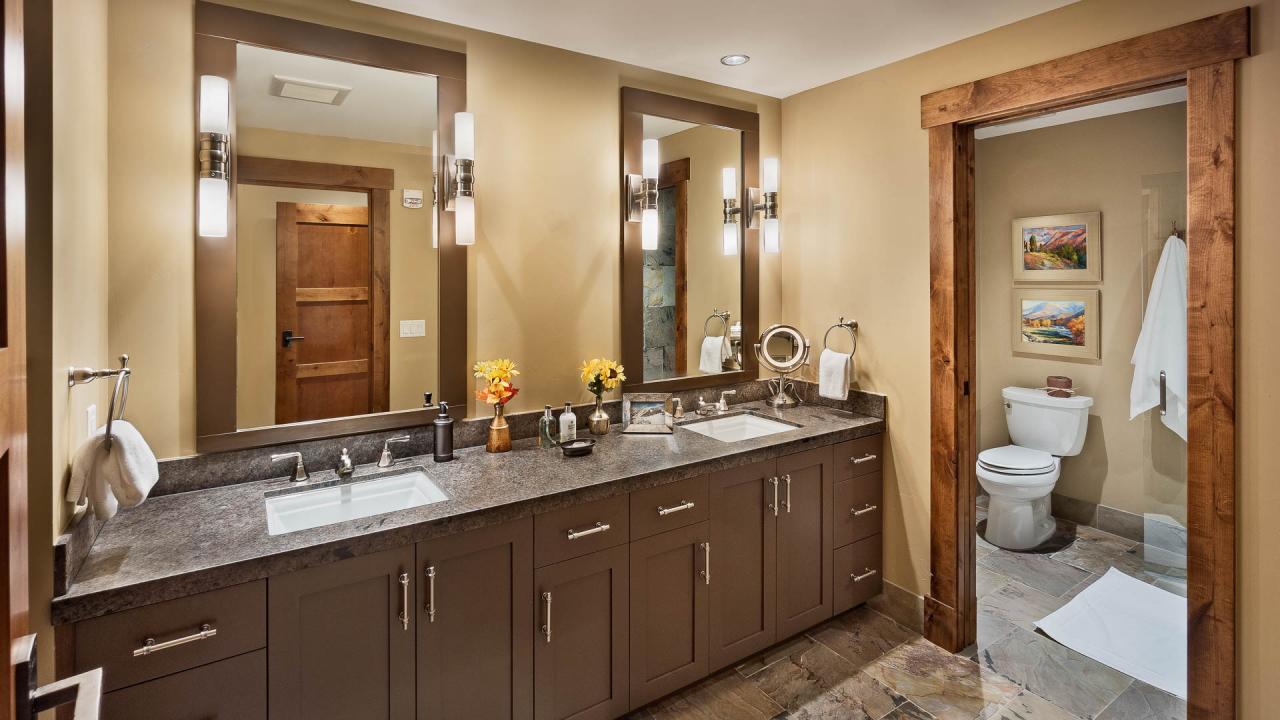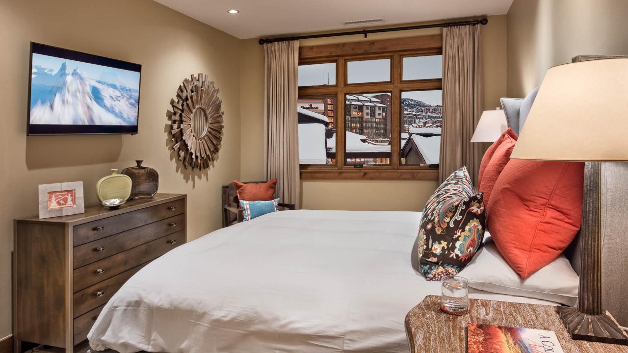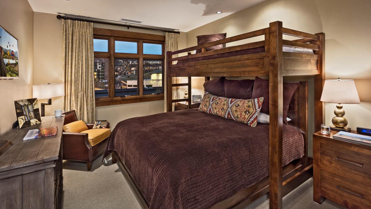 All One Steamboat Place residences feature rich colors, natural textures, and sumptuous fabrics throughout the home. Each master bedroom offers a gas fireplace. The main master bath features a flush entry shower and Jacuzzi tub. In this residence 2 bedrooms offer a King bed with private bath. The third bedroom offers a King bed and Twin bunk. The fourth offers a King with Twin bunk, all with a private bathroom. One of the bathrooms is fully ADA compliant.