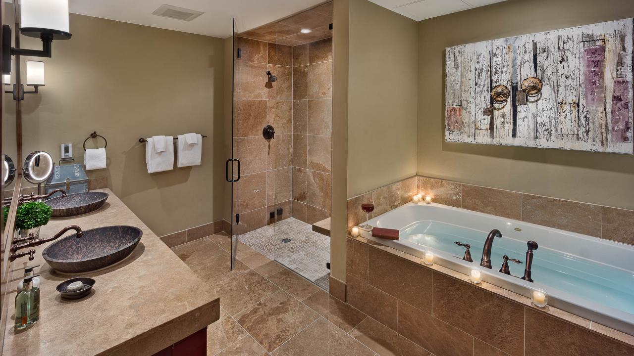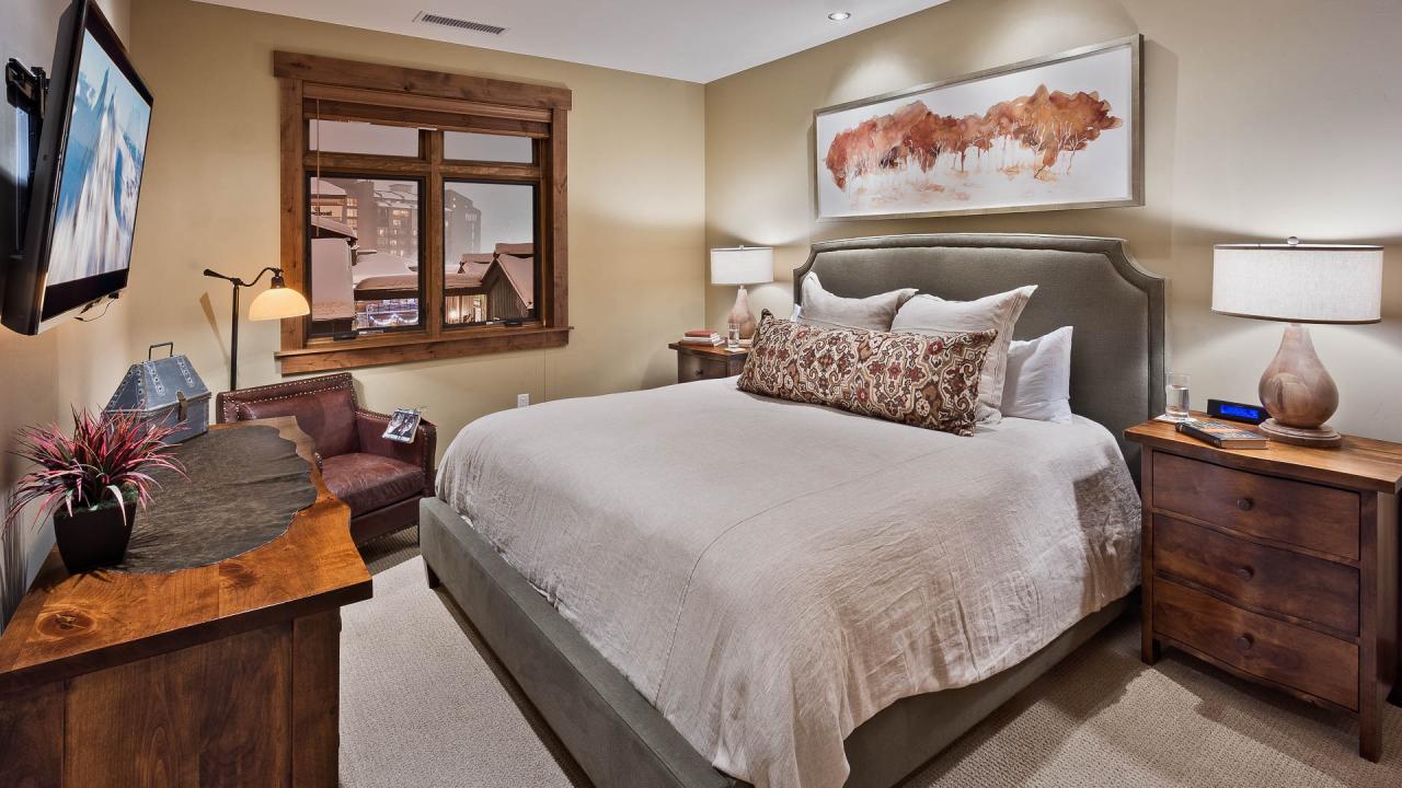All One Steamboat Place residences feature rich colors, natural textures, and sumptuous fabrics throughout the home. Each master bedroom offers a gas fireplace. The main master bath features a flush entry shower and Jacuzzi tub. In this residence 3 bedrooms offer a King bed with private bath. The third bedroom offers a King bed and a fully ADA compliant bathroom. The fourth offers a two sets of bunks - each with a Twin bed over a Queen bed also with a private bathroom.