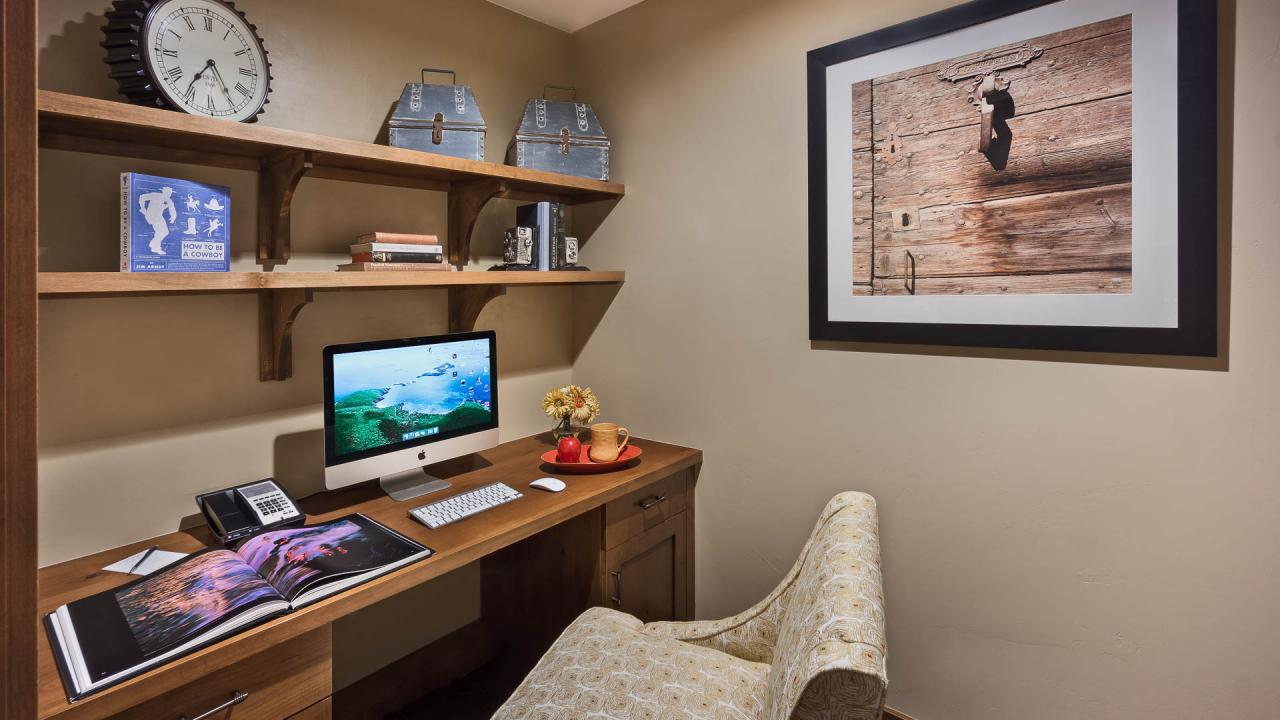 The home office nook boasts an iMac home computer and high speed Wi-Fi throughout the residence allowing internet service for all guests. A printer is available at the front desk and guests can also videoconference with the front desk from the home office.