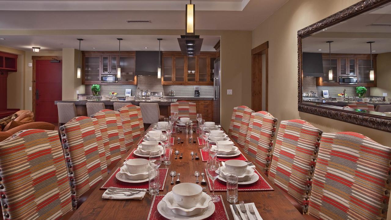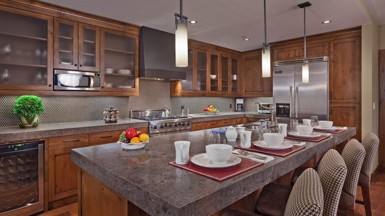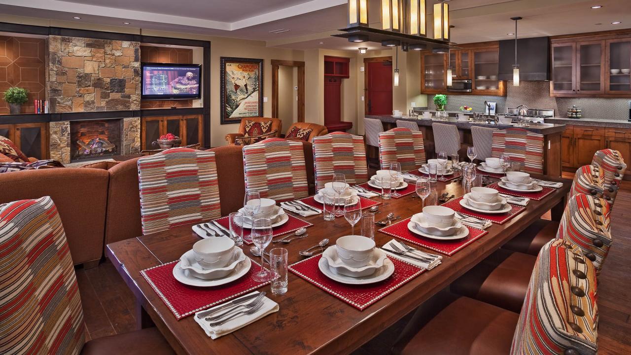 The Trickle Creek Mountain Residence at One Steamboat Place features a large living area and kitchen. An extra-long kitchen island and counter space makes this resident perfect for large groups or for those who like to entertain company during their stay.