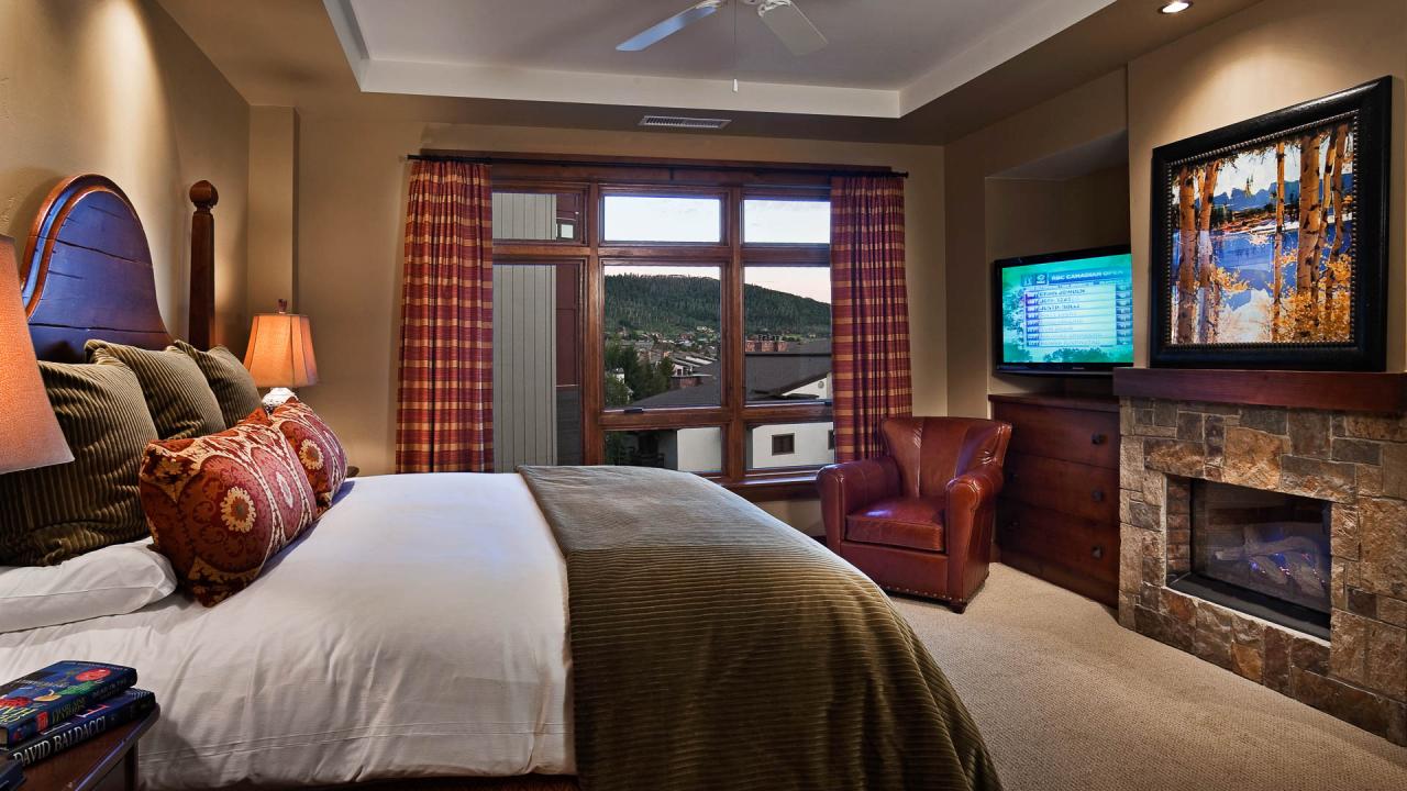 - Bedroom 1: Primary with king bed, en suite bathroom with shower and bathtub, fireplace, TV