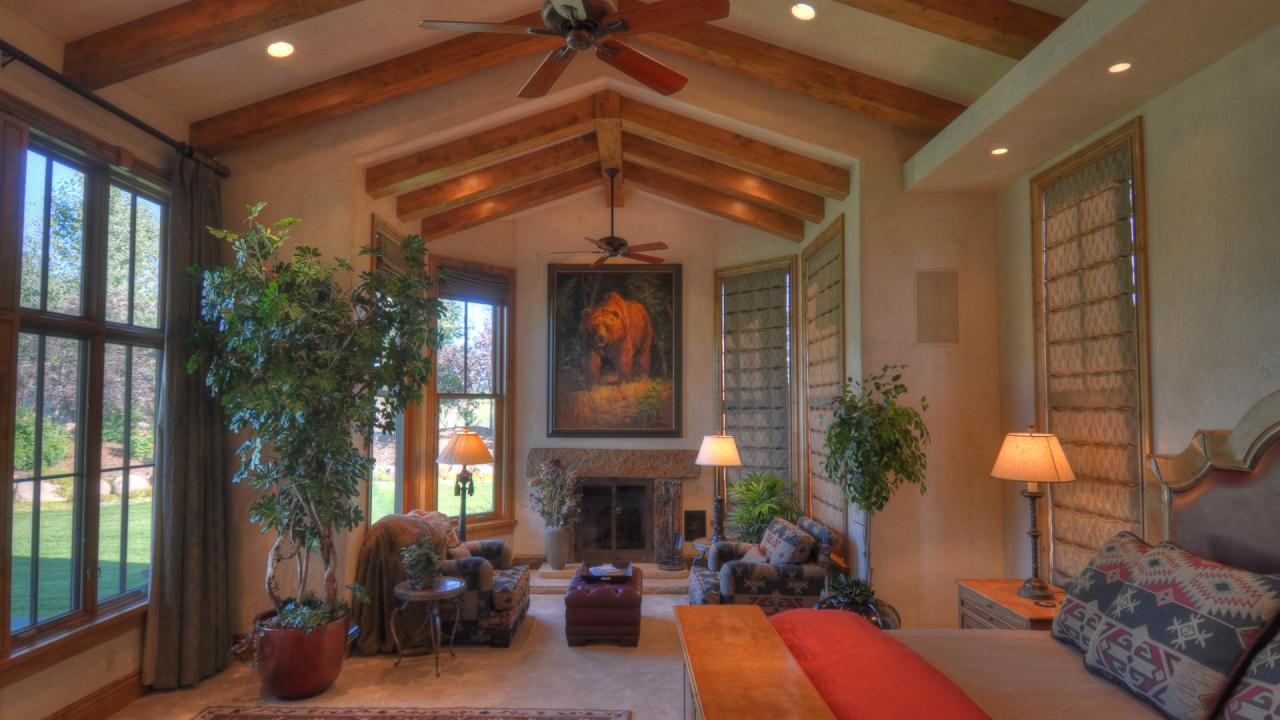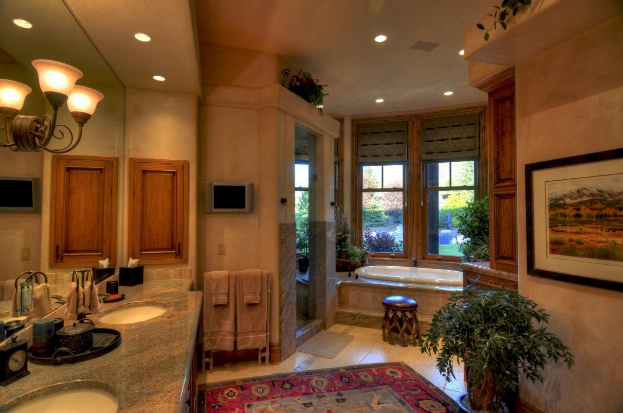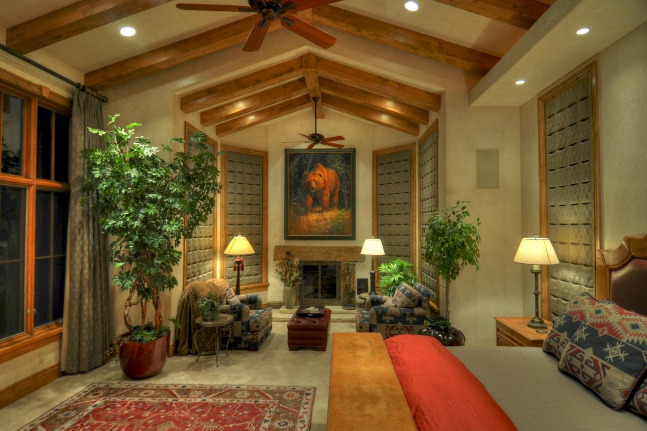 Guests will immediately be greated by a two story rock fireplace which passes through to the Great Room featuring 25 foot ceilings, a large TV, and plenty of comfy seating to allow enjoyment of the massive windows and views. The kitchen is just off hte great room and will thrill chefs of every level. Granite counters, 6-burner gas stove, and copper hood area ll waiting to inspire a creative dinner to spring from the double oven and oversized refrigerator. The dinning room seats 12 comfortably and features windows with views, much like most rooms of the house.