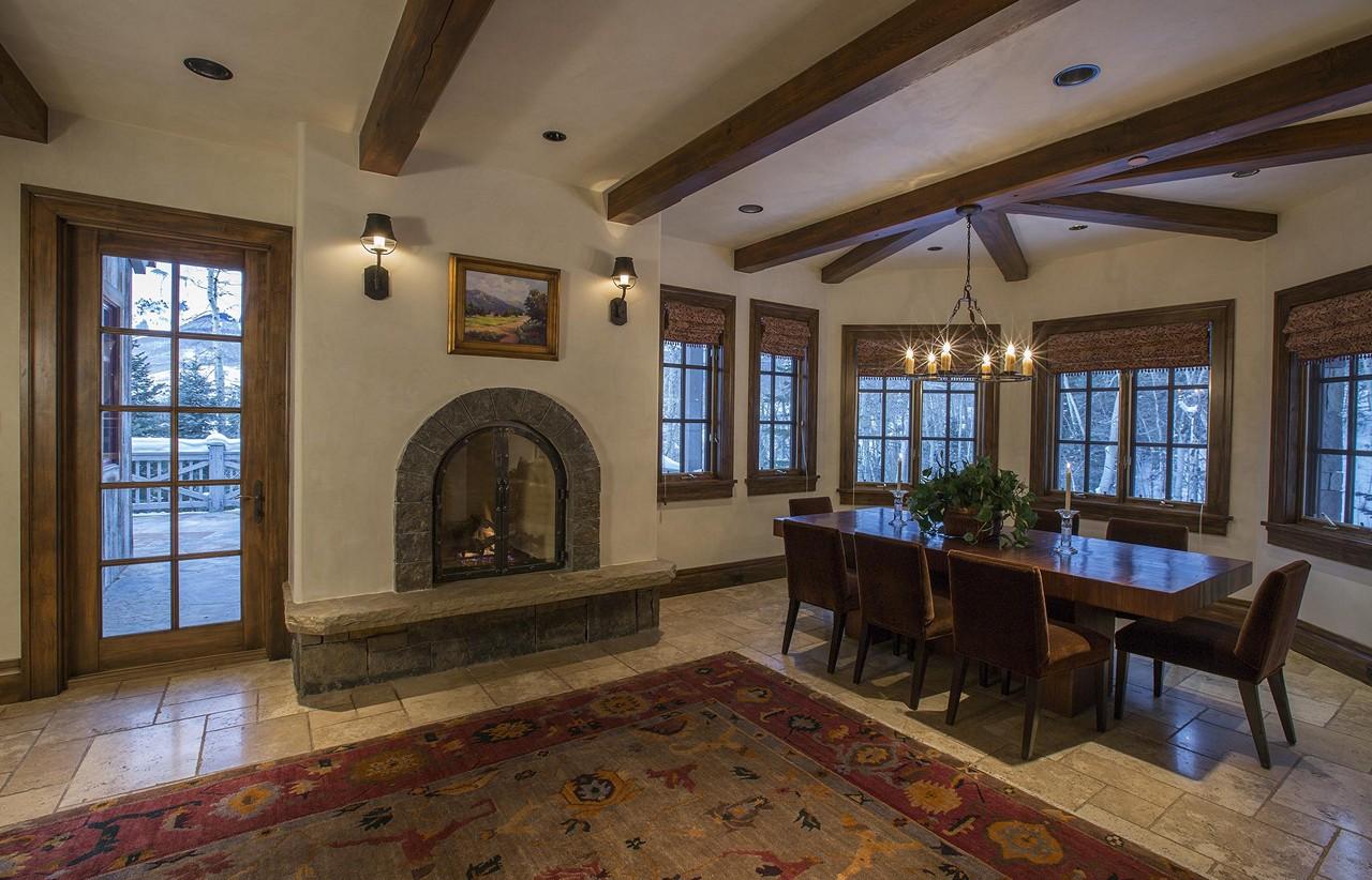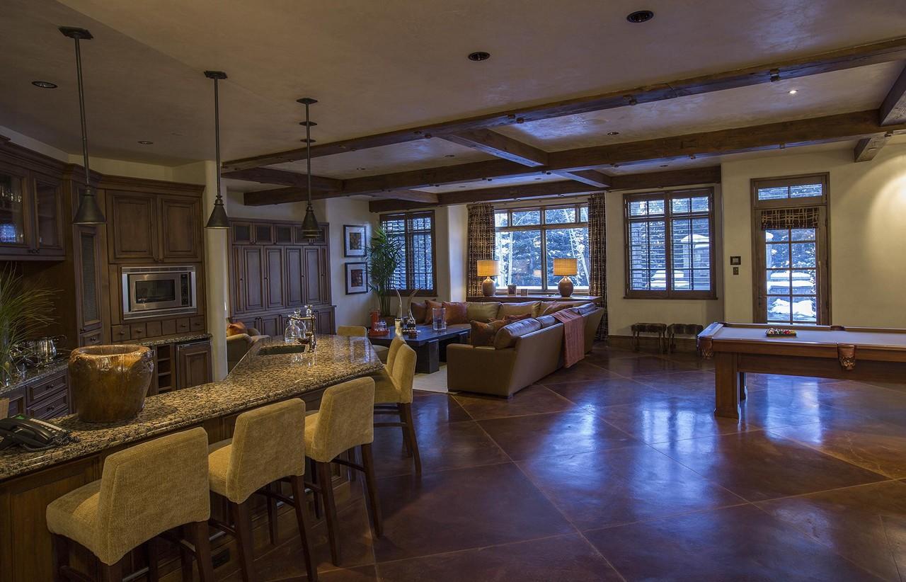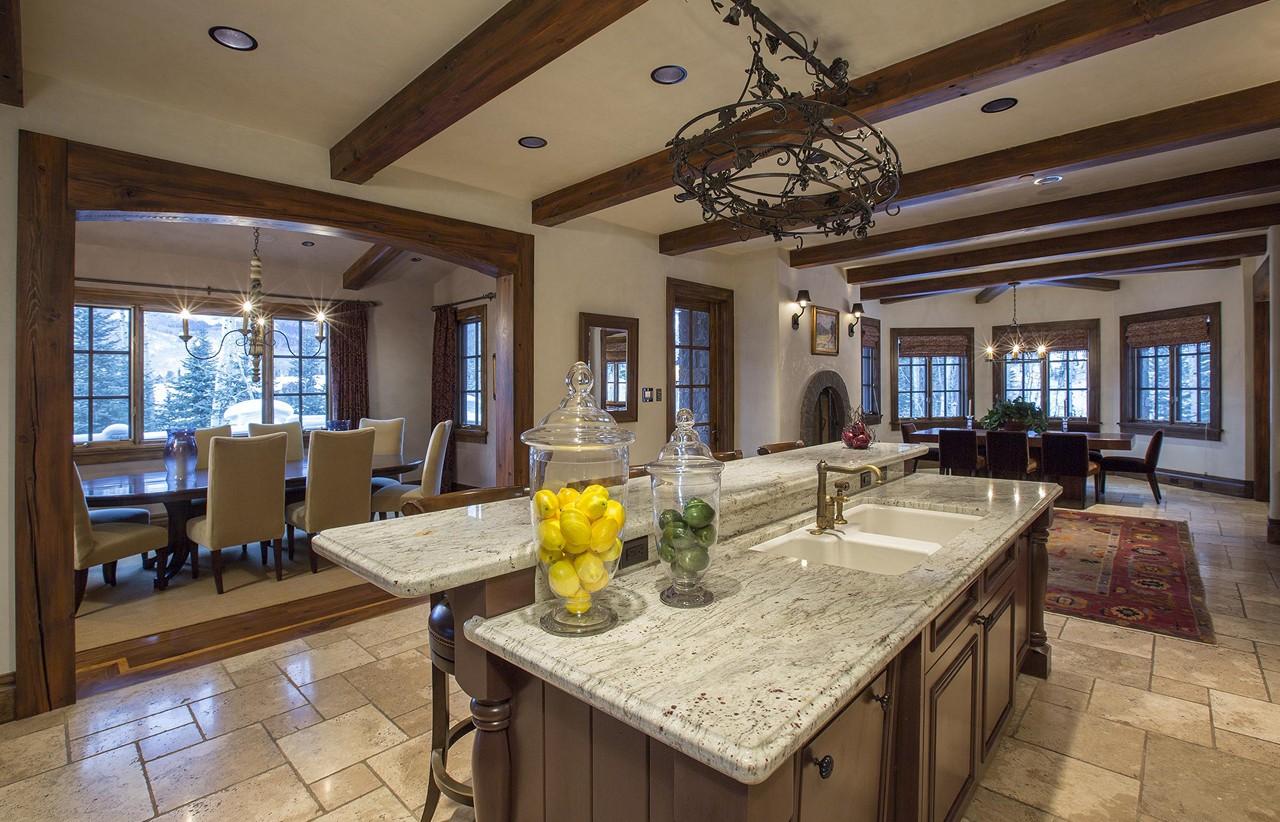 Upon arriving to the home, guests are greeted by an amazing stone exterior as well as garaged parking for three vehicles. An impressive large wooden door opens into the foyer where venetian plaster walls, slate floors and wooden beam detail begin and continue to stretch throughout the home’s entirety. Beyond the entryway, the first powder room and a private office for two, the great room faces south and is unforgettable with its vaulted ceilings, colossal picture windows framing expansive San Sophia views. Take it all in from the comfortable couches and oversized armchairs surrounding a grand gas fireplace and large flat screen TV. A meeting table on the west wall of the living area is framed by shelves and built-in L-shaped bench, creating a great place for games, breakfast and catching up with friends. Doors off either side of this room lead out to the home’s deck system which descends to the ground level’s large, in-ground hot tub.