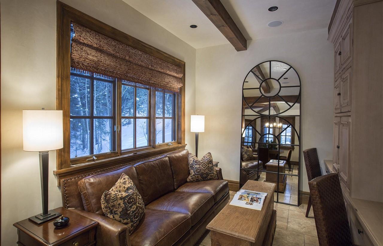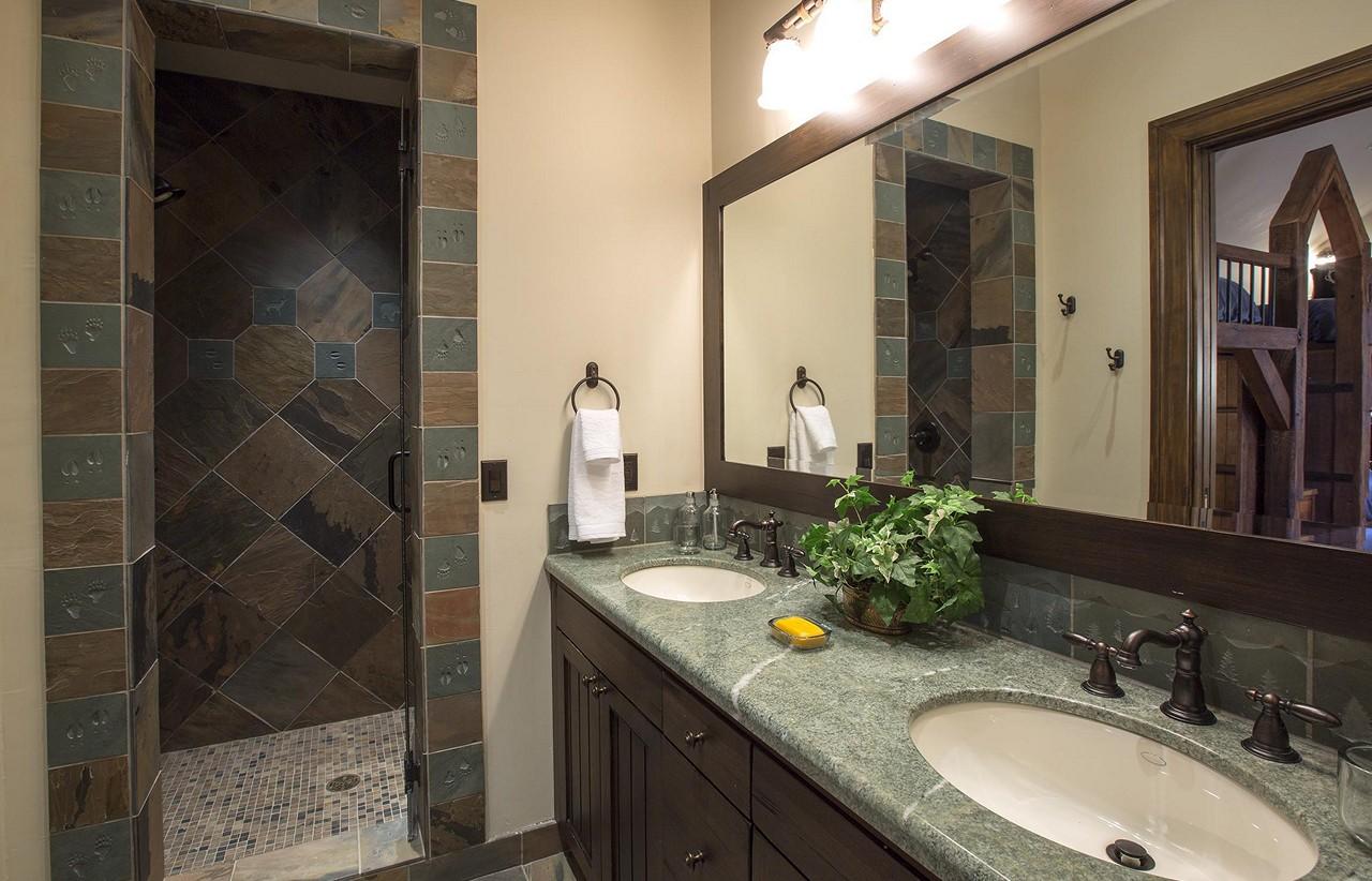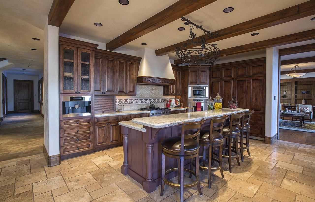 Upon arriving to the home, guests are greeted by an amazing stone exterior as well as garaged parking for three vehicles. An impressive large wooden door opens into the foyer where venetian plaster walls, slate floors and wooden beam detail begin and continue to stretch throughout the home’s entirety. Beyond the entryway, the first powder room and a private office for two, the great room faces south and is unforgettable with its vaulted ceilings, colossal picture windows framing expansive San Sophia views. Take it all in from the comfortable couches and oversized armchairs surrounding a grand gas fireplace and large flat screen TV. A meeting table on the west wall of the living area is framed by shelves and built-in L-shaped bench, creating a great place for games, breakfast and catching up with friends. Doors off either side of this room lead out to the home’s deck system which descends to the ground level’s large, in-ground hot tub.