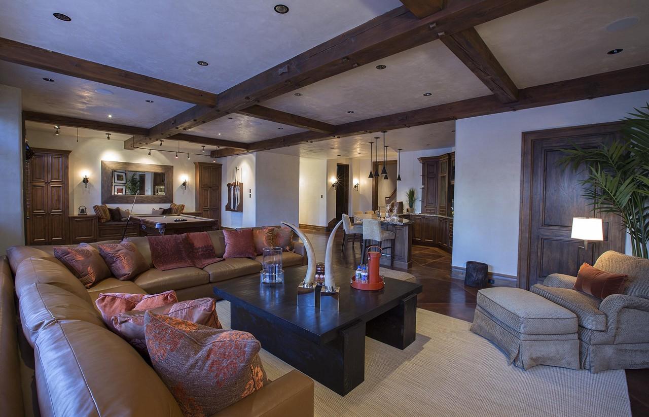 East of the great room is an incredible space for group dinners and meal preparation. A south-facing dining room with seating for up to eight faces out and enjoys more of the beautiful San Sophia panorama, sitting opposite the gourmet kitchen. Granite countertops, breakfast bar for four, custom cabinetry, stainless steel appliances including two refrigerators, two ovens and two dishwashers as well as an espresso maker from Miele leave even the most discerning chef wanting for not. Another beautiful dining table lies just past the kitchen, and has seating for an additional eight guests and enjoys a lovely gas fireplace. An intimate sitting room with leather sofa, two small work desks and a television sits adjacent to this area. Spanning the distance from the dining rooms to the home’s two-car garage, a long hall hosts a full laundry room, elevator and powder room in between.
