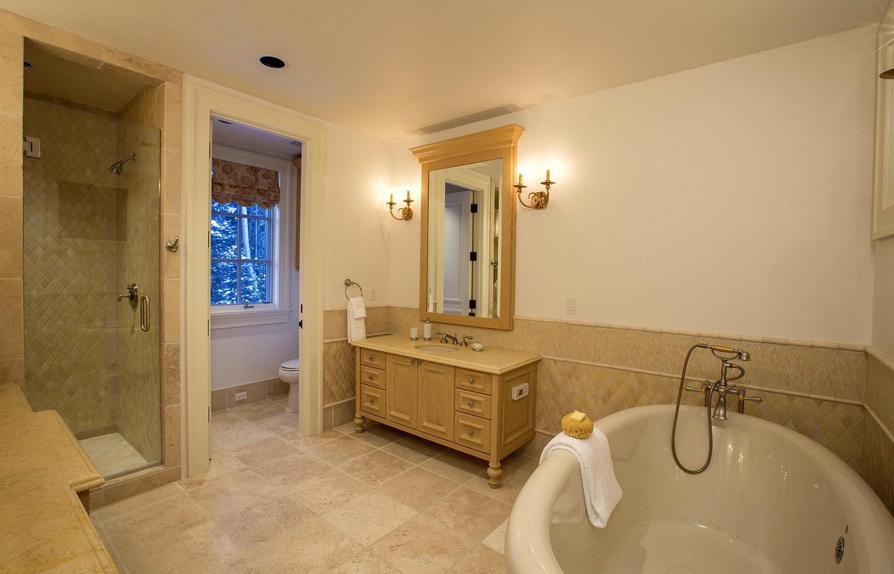 The lowest level of the home is absolutely ideal for entertaining. Painted concrete floors make way to a large media room and full bar with seating for six, equipped with granite countertops, ice maker, mini fridge, microwave and dishwasher. The adjacent media center has an oversized leather sectional with plenty of seating around the huge flat screen TV paired with surround sound, making for the ultimate in movie nights. A pool table completes the space, and provides for endless fun. A ground level walk-out, this room leads directly to the sizeable in ground hot tub. A wine cellar, ski room with full washer/dryer, sink and cubbies as well as the seventh and final bedroom are located on the east end of the ground level. The queen bed with south-facing French doors and en suite bathroom with shower/tub combination create an inviting escape for any guest.