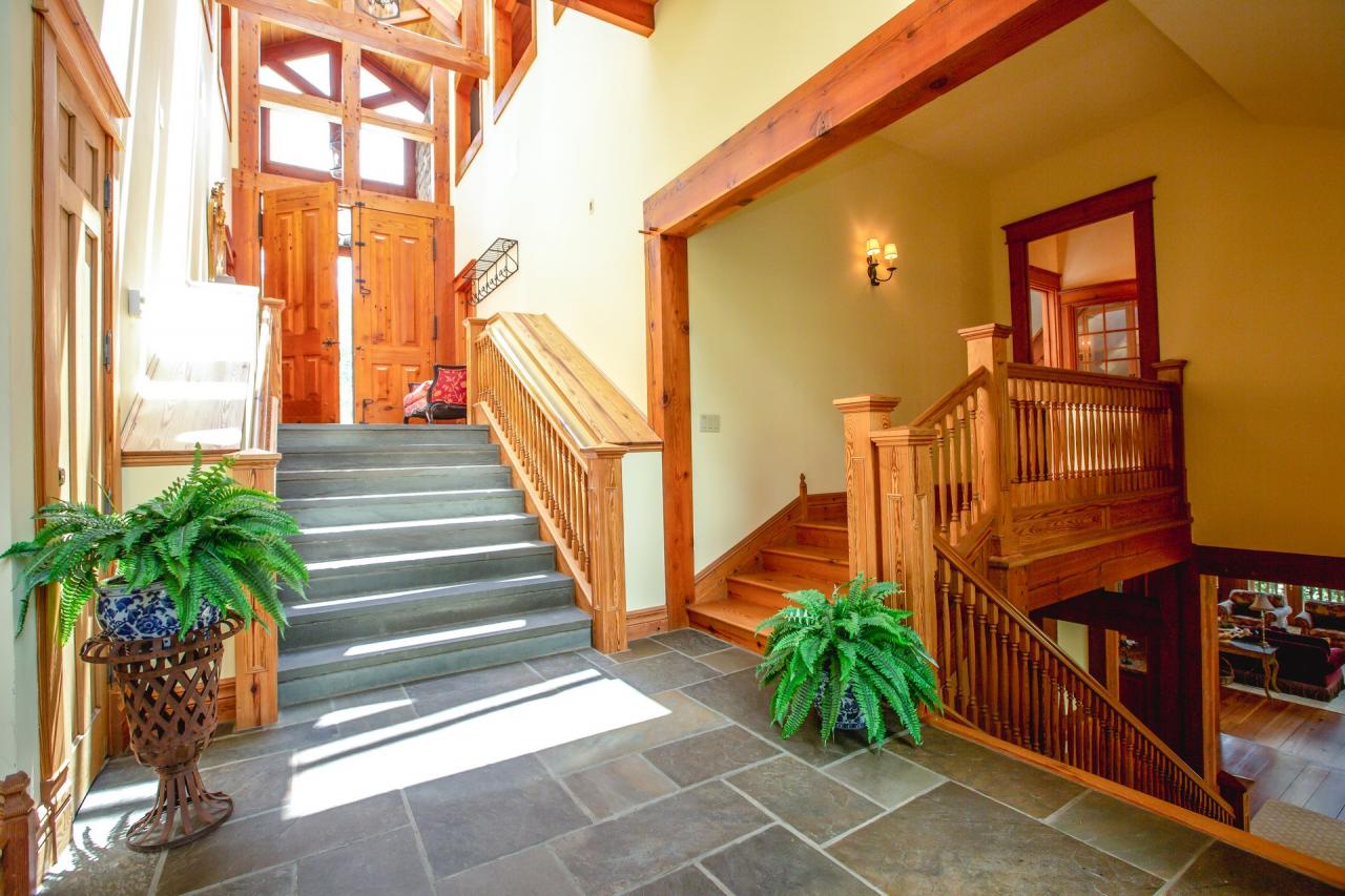 Guests are welcomed into this amazing home via a slate tile entry. The entry has immediate access to the home's garage as well as a seating area complete with hooks and storage for guests entering/leaving. The master suite is located on the main entry level while the living level is located just below.