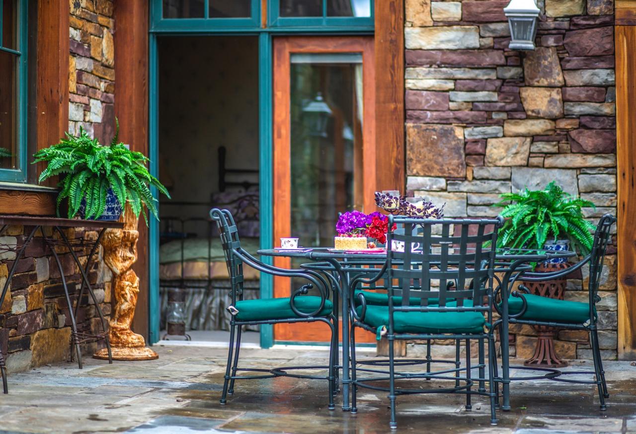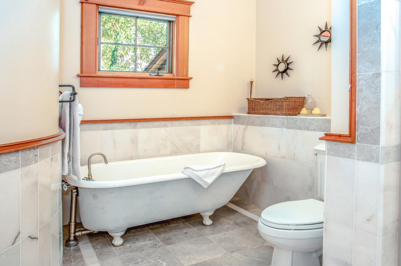 The two guest suites on the living level each have spacious en suite bathrooms. Guest 1 hosts a flat screen television, velvet settee and glass shower. Guest 2 features a sofa with views of the main patio area. Guest 2's en suite bathroom is home to a claw foot tub.