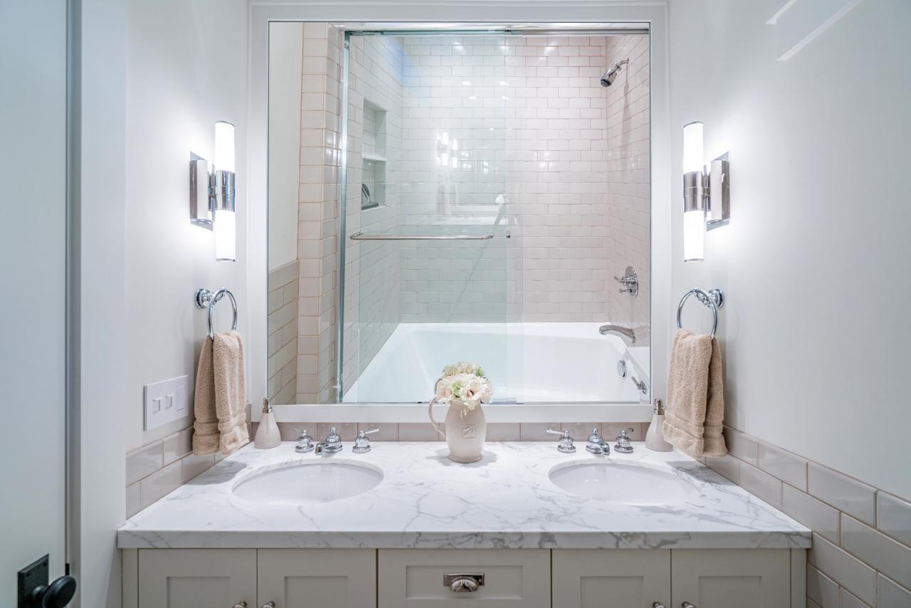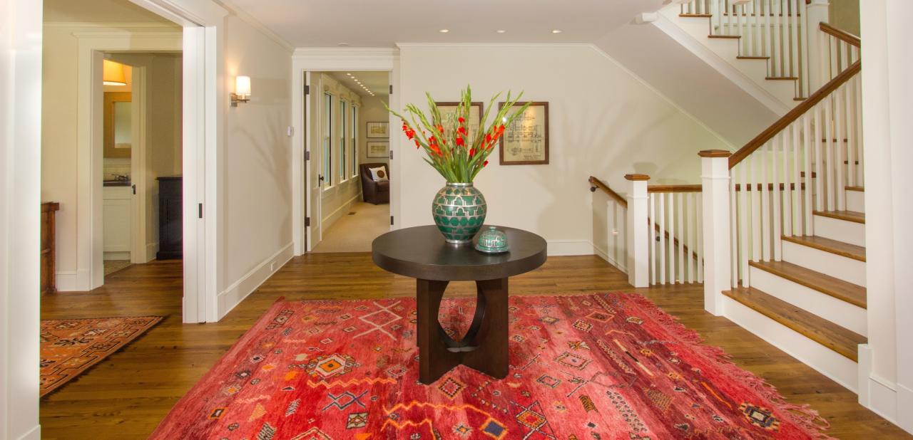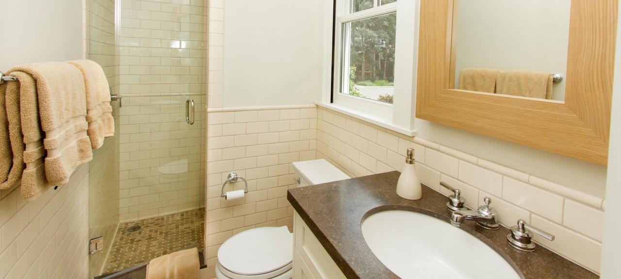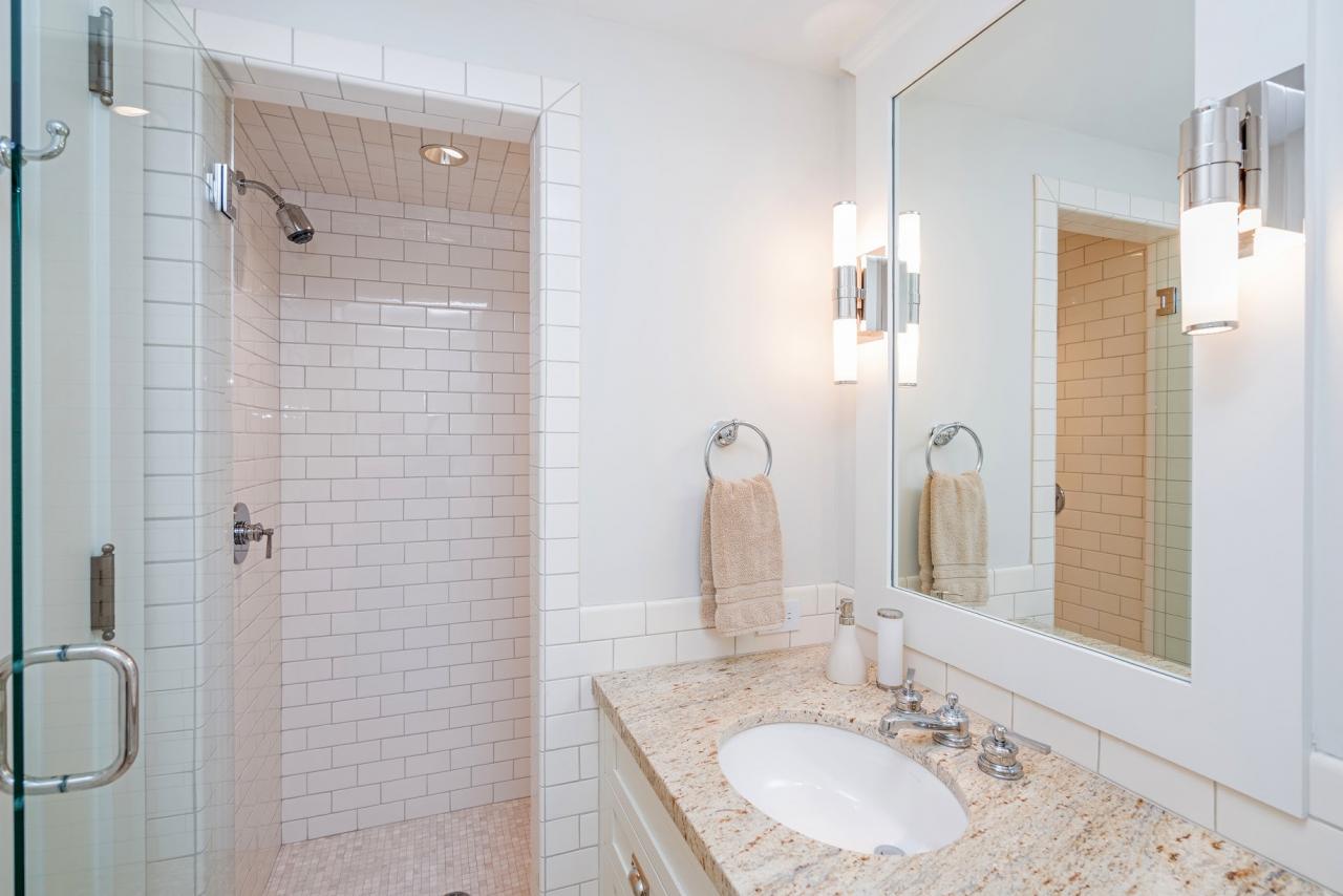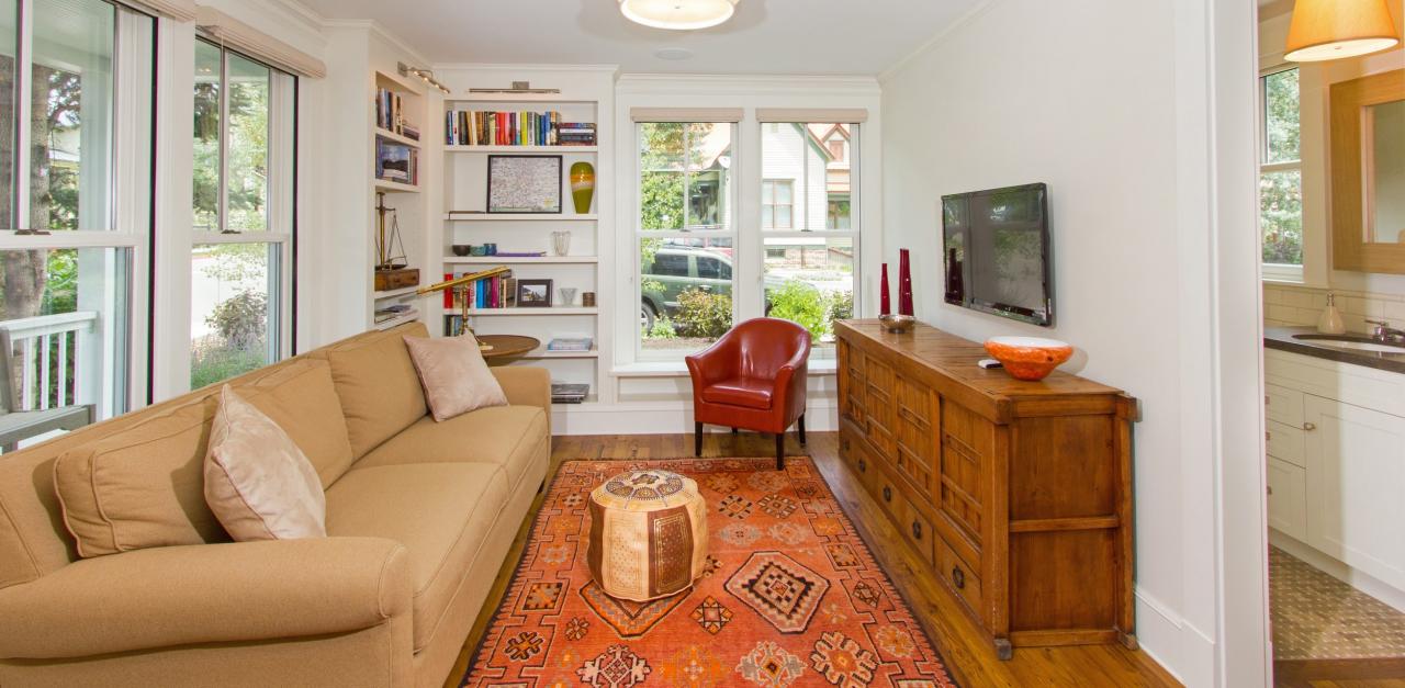 Upon entering Spruce House, you are welcomed into the home's foyer where there is a seating bench and closet for you to make yourself at home. Antique chestnut floors and off-white walls create a warm and welcoming atmosphere. On the left of the foyer is a cozy library with a camel-colored sofa and a flat-screen TV. This sofa folds out to a queen-sized sofa bed. The den also has its own private bathroom, so this area could be made into an additional private sleeping room. Next to the den is the king-sized master suite. The master suite has a walk-in closet, and a huge marble bathroom with a steam shower and free-standing tub. The master suite also has French doors that open onto a small deck.