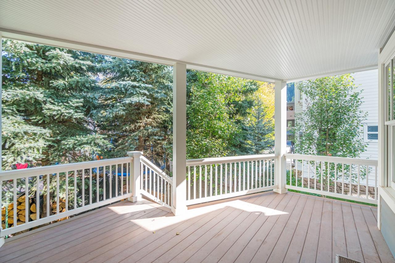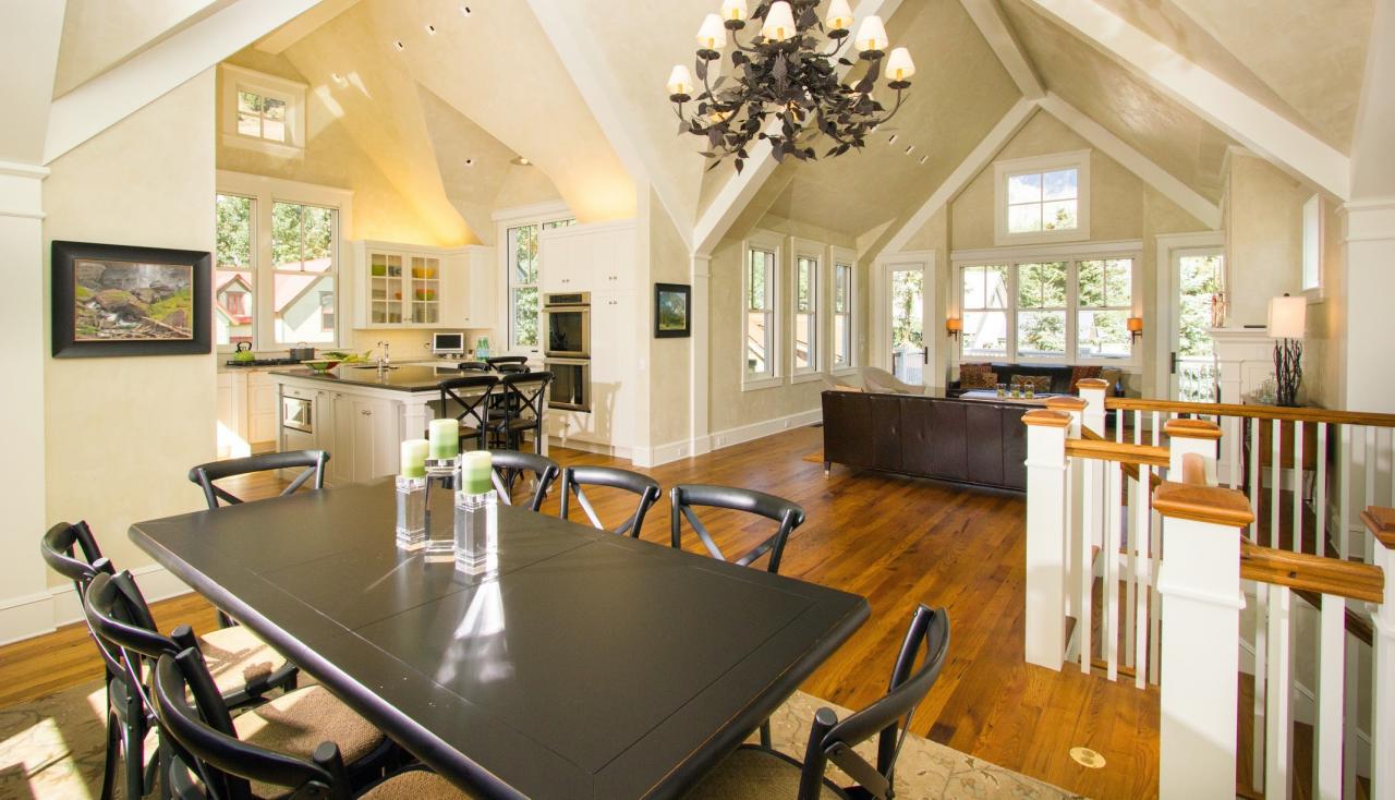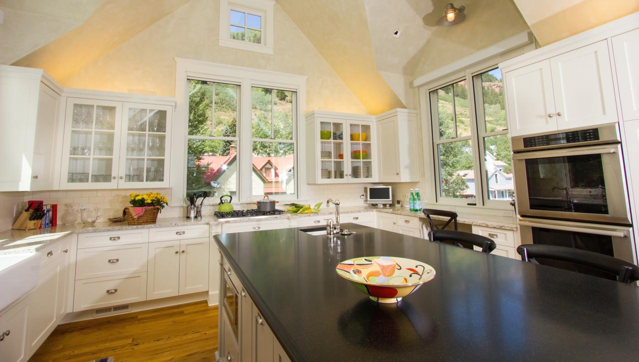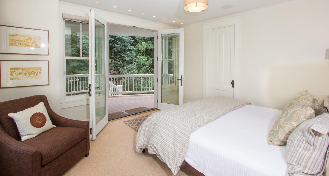 The upper level of the home is occupied entirely by an impeccably stylish, open plan great room. The great room has lofty vaulted ceilings and countless windows framing impossibly perfect views of Ajax Peak, Bear Creek, and the front side of the ski resort. There is a full gourmet kitchen with brand-new stainless steel appliances, granite countertops, two dishwashers and a TV. There is a dining table for ten, as well as a chic seating area surrounding a gas fireplace. There are two decks on either end of the great room – one facing east and the other facing west.