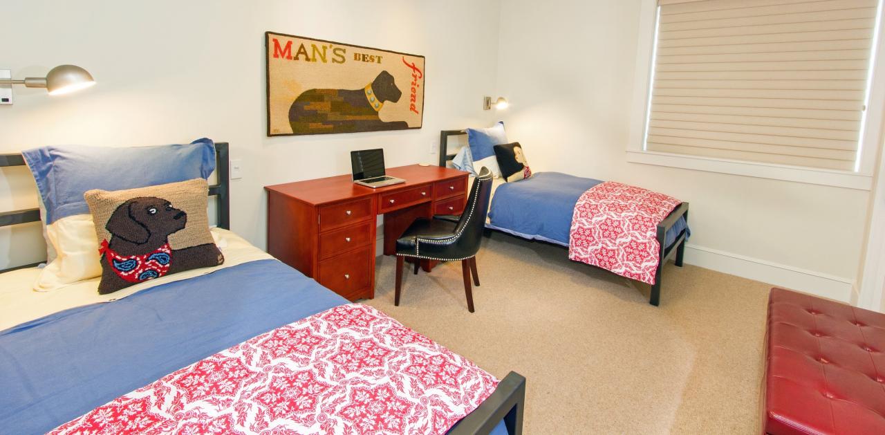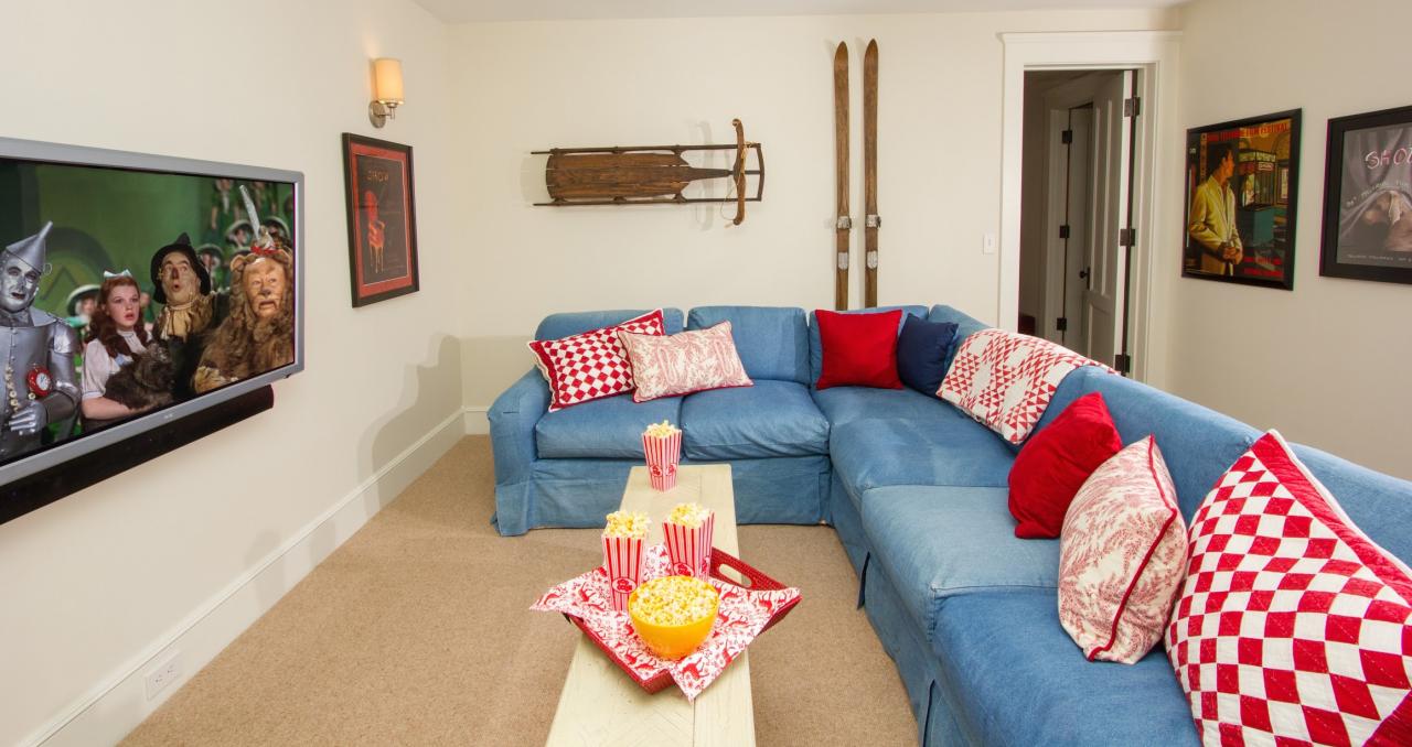 On the lower level of the home there are two additional guest suites and a TV watching area. One of the guest suites has two single beds and a private bathroom with a shower. The other guest suite has a king-sized bed and a private bathroom with a combined shower/tub. There is a TV room in the communal area of this lower level, with a large L-shaped sofa surrounding a flat screen TV. This sofa can also fold out to a queen sleeper sofa if required. There is also a laundry room on the lower level.