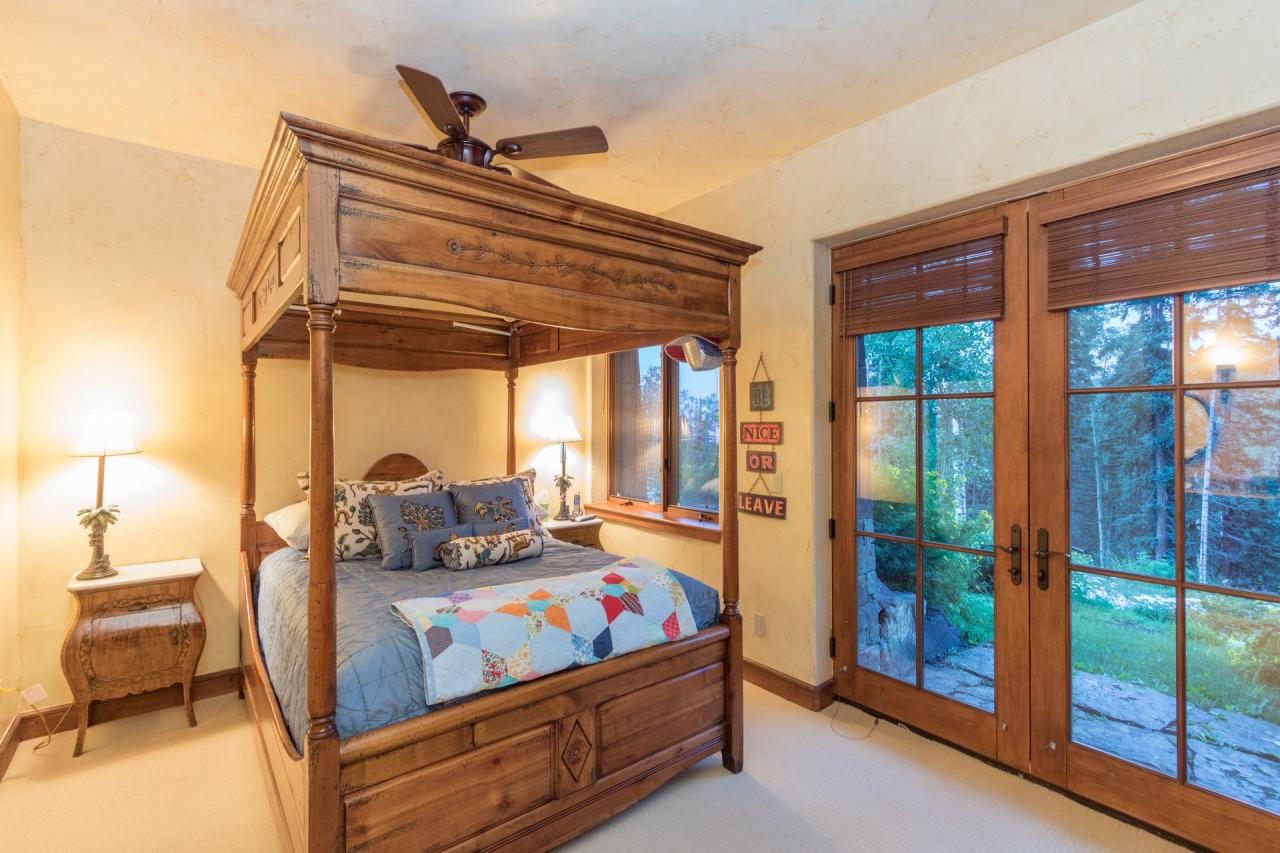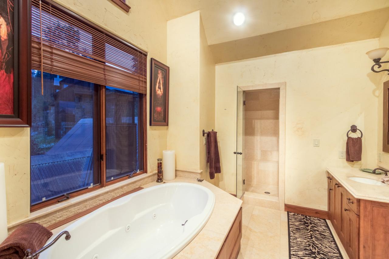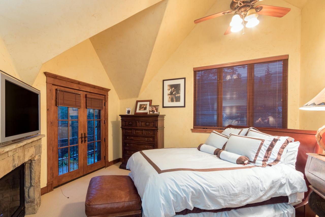Additional guest suites are located on the lower and main levels of this villa. Guest 1 features a queen sleigh bed, gas fireplace, flat screen television, and French doors to a Juliet balcony. This guest room is also home to an en suite bathroom with steam shower and jettied soaker tub.