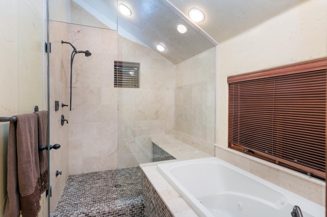 Spacious master suite filling the entire top floor of this luxury villa. This suite features a gas fireplace with ultra-comfortable king size bed, flat screen television, and French doors accessing the private balcony viewing the San Sophias. This bedroom is home to an en suite bathroom with large jetted Jacuzzi tub, steam shower, and dual bench vanities.