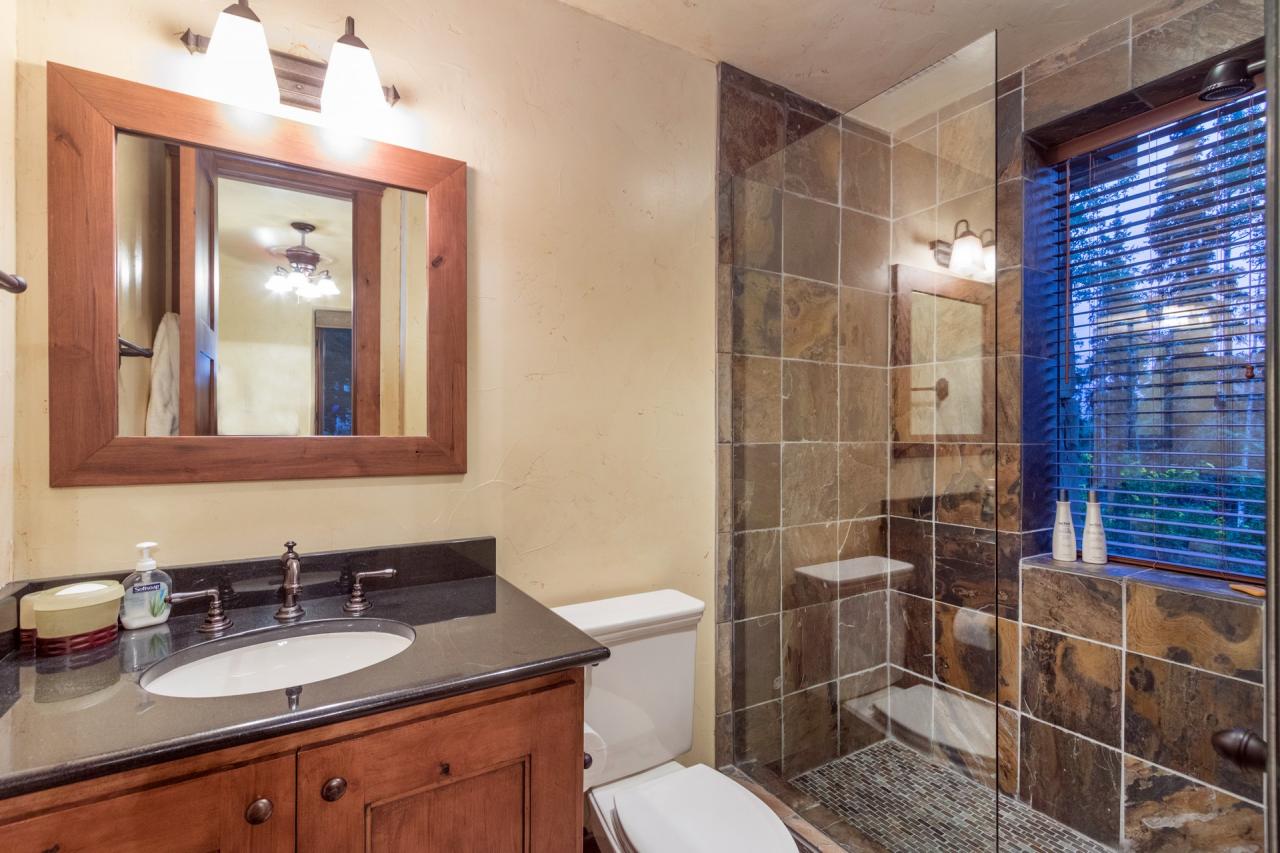 Guests enter Stonegate Chalet via the grand stairway. Both the living room and kitchen space are immediately accessible. Warm up by the gas fireplace in the liviing area surrounded by comfortable seating. Entertain or relax watching a movie on the flat screen. Stonegate Chalet provides a large selection of board games to supply game night! French doors access two separate patios from the living area. The first patio is home to an outdoor dining area for two as you gaze upon the San Sophia Ridgeline. The second patio is also accessible from the kitchen.