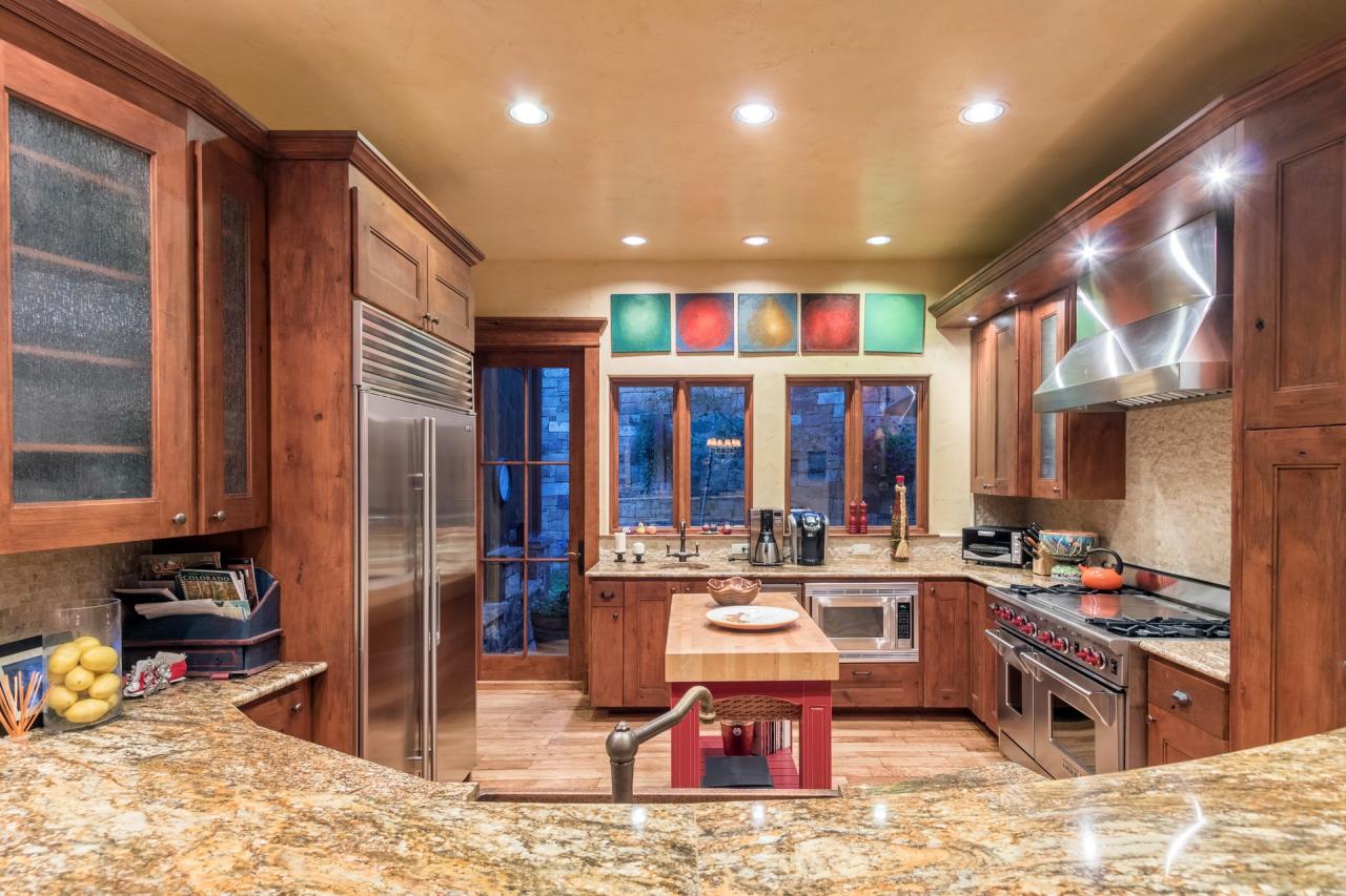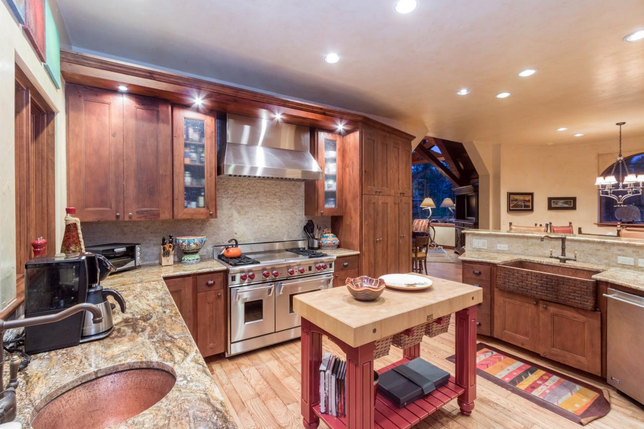 Stonegate Chalet comes fully equipped with a gourmet kitchen. Chefs of all levels will enjoy the high-end stainless SubZero and Wolf appliances. A stylish butcher block island offers ample space and seating for three surrounded by custom millwork. Guests can enjoy the fruits of their labor in a separate dining room seating eight. The outdoor patio just off the kitchen also features a gass grill, private hot tub, and al fresco dining area.