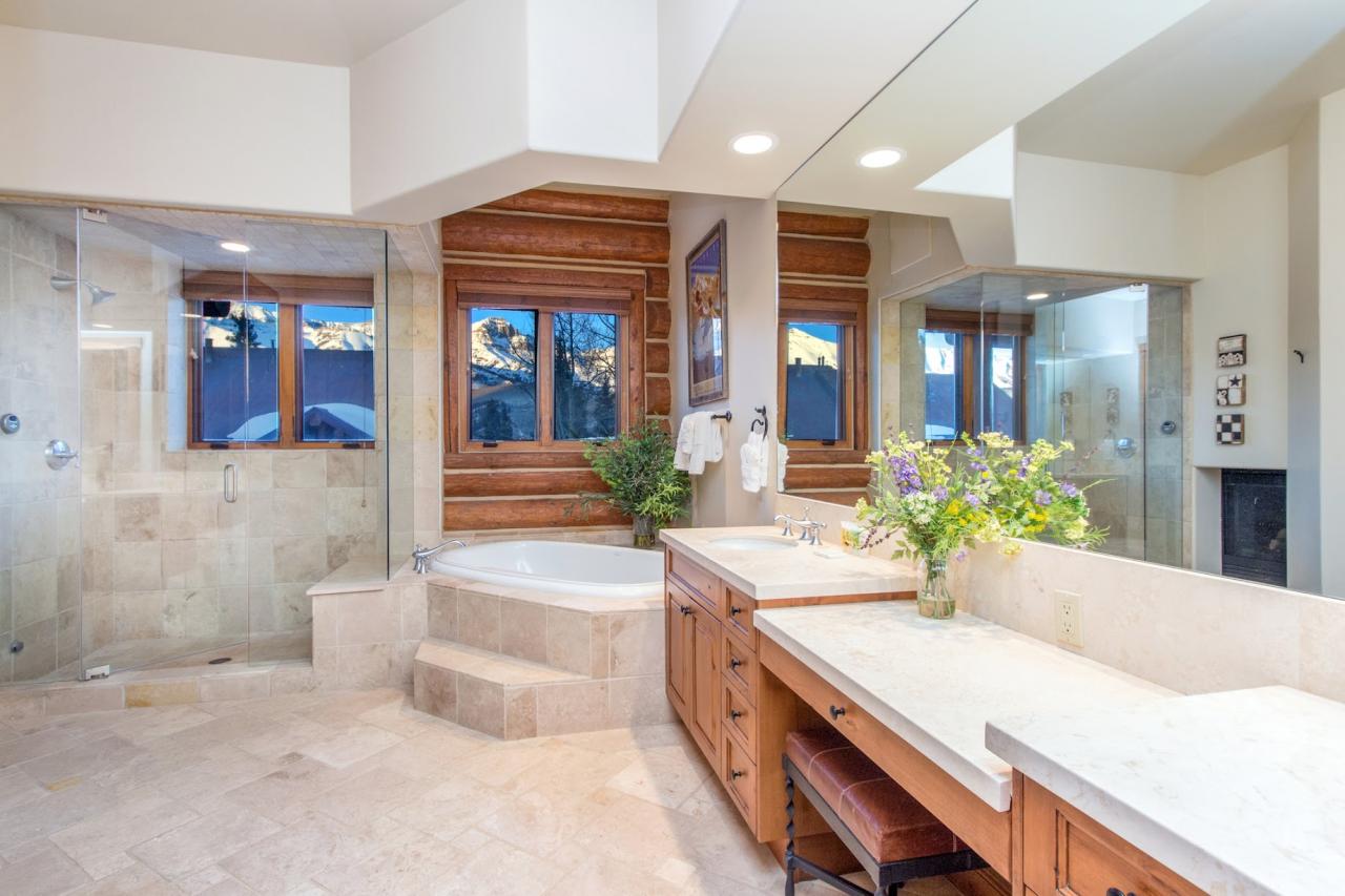 Enter into the foyer and travel up a half flight of stairs to the great room with vaulted ceilings and wooden beam detail, composed of a comfortable living area, gourmet kitchen and dining room. In the living room guests enjoy a couch and two chairs surrounding the gas fireplace and flat screen TV – perfect for lounging after a long day of hiking, biking or skiing through the beautiful Mountain Village! For those who enjoy games, there is a small game table with two chairs here, too. Step through the room’s French Doors to the balcony with Wolf gas grill and views of the San Sophia Ridgeline and Telluride Ski Resort. For the rest of your culinary needs, the kitchen is equipped with stainless steel appliances from Wolf, SubZero and Bosh, a wine refrigerator and granite countertops creating a breakfast bar for three. For additional dining options, the dining room, which is connected to the kitchen, seats up to eight guests.