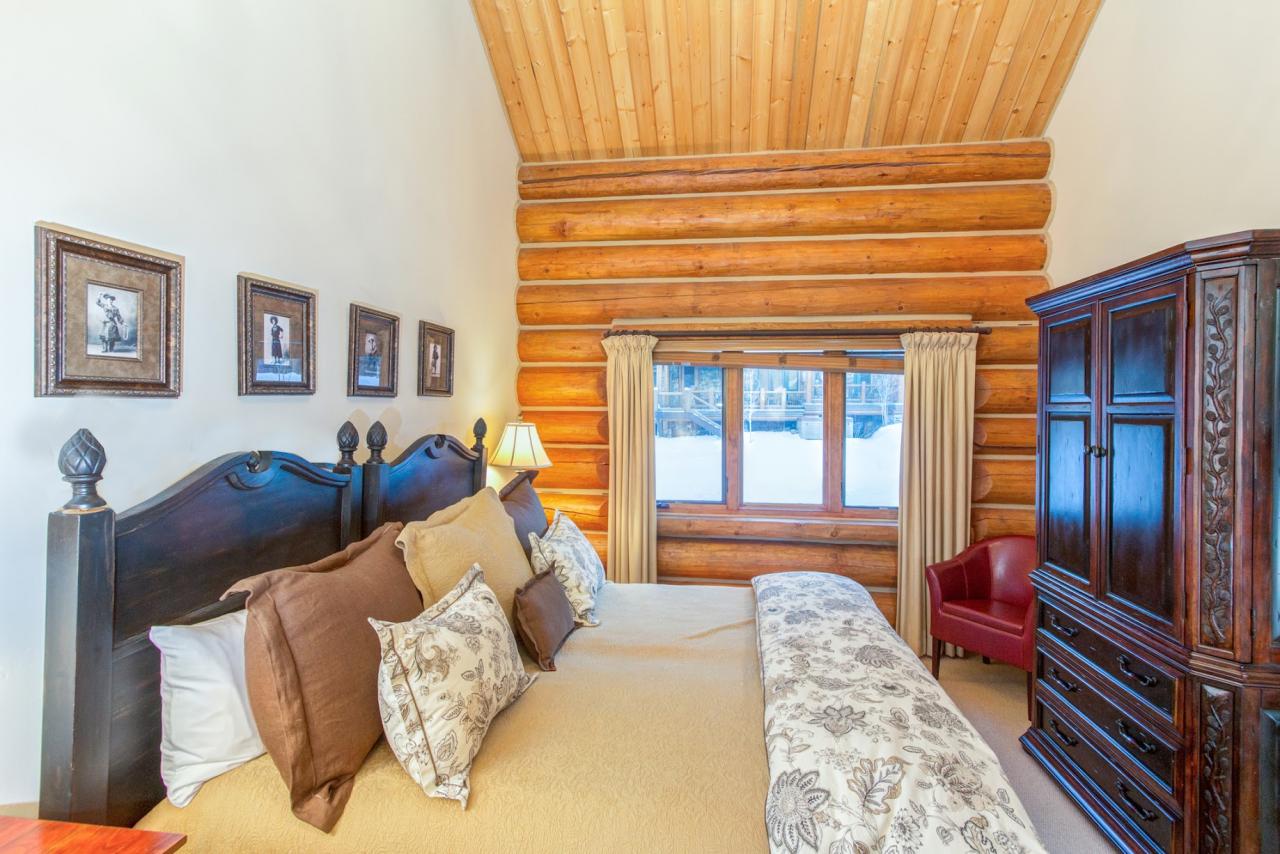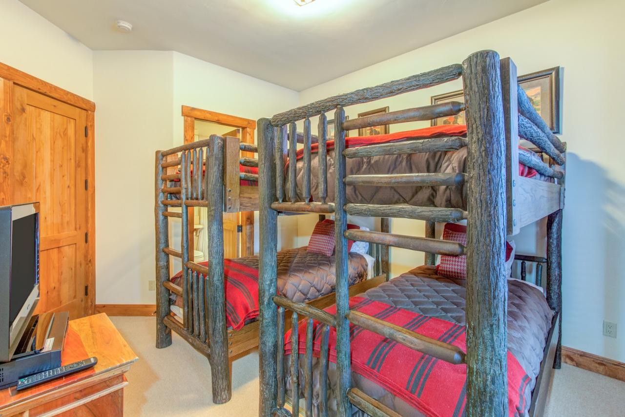Down one more flight of stairs is the home’s lowest level where, on the left, guests will find a side door to the exterior for incredible ski access just 50 feet away. Across the hall on the right is an ultra-convenient cubby storage area, followed by a laundry room with full-size washer/dryer, sink and coat closet. Because of the proximity to the slopes, the powder hounds in your group may appreciate staying in one of the two final guest rooms. The room on the left is a bunk room complete with four twin size beds, set up into two bunks, flat screen TV with DVD/VCR combo, French doors to the home’s private hot tub and full en suite bath with a combination shower/tub. The room on the right is another split king suite with flat screen TV, DVD/VCR combo and French doors to the ground level patio with a similar en suite bath as the previous suite.